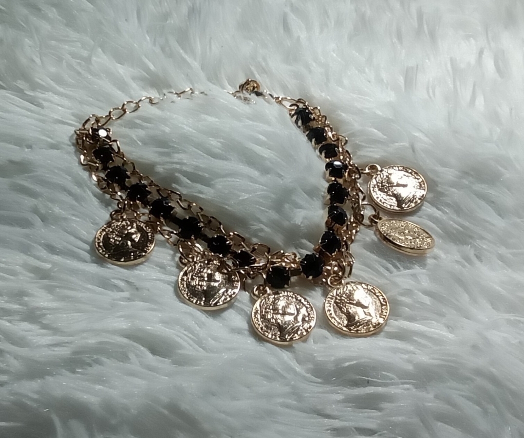 PULSEIRA TRIPLA PRETA MEDALHAS PEDRAS